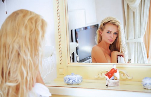 Блондинка модель показывает сексуальное тело без одежды после душа